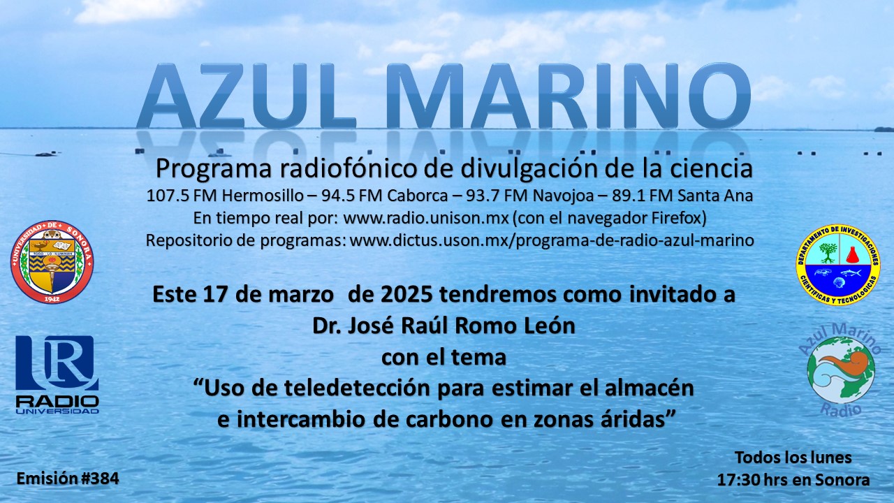 Collection Programa de Radio Azul Marino Item Uso de teledetección para estimar el almacen e intercambio de carbono en zonas áridas Documento 384 Raul Romo 17Mar2025 Descargar Información: Thumbnail # emisión384TemaUso de teledetección para estimar el almacen e intercambio de carbono en zonas áridasDescripciónUso de teledetección para estimar el almacen e intercambio de carbono en zonas áridasInvitadosDr. José Raúl Romo LeónFecha17 marzo, 2025Audio Continuar navegando... El cine y la divulgación de la ciencia Temas selectos del equipo de producción y conducción Back to items list