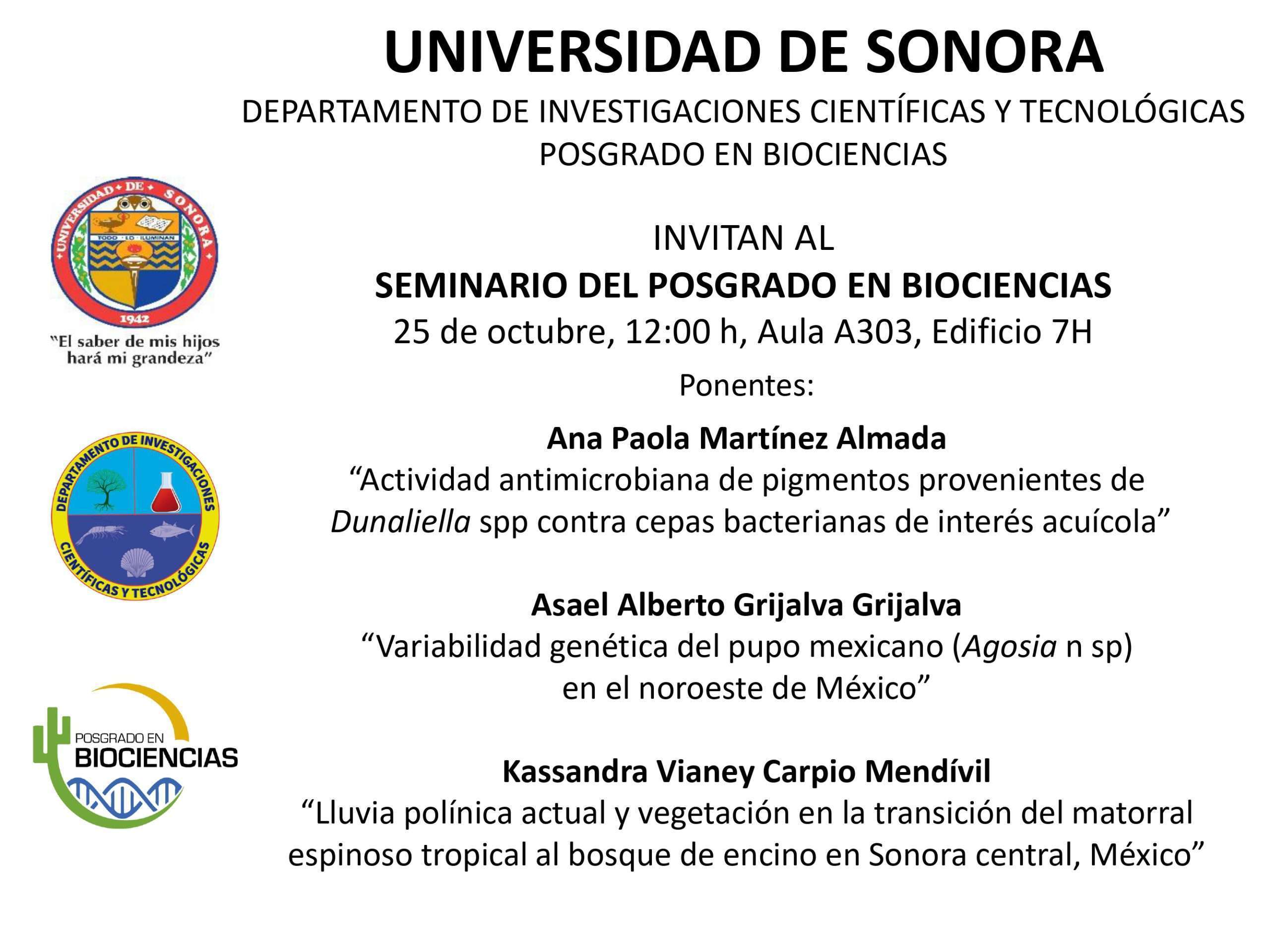 SEMINARIO DE POSGRADO EN BIOCIENCIAS 25 DE OCTUBRE 2023 23 octubre, 202323 noviembre, 2023Difusión Departamental Ana-Paola-Martinez-AlmadaDescarga Asael-Alberto-Grijalva-GrijalvaDescarga Kassandra-Vianey-Carpio-MendivilDescarga Última actualización el 23 noviembre, 2023 por Difusión Departamental